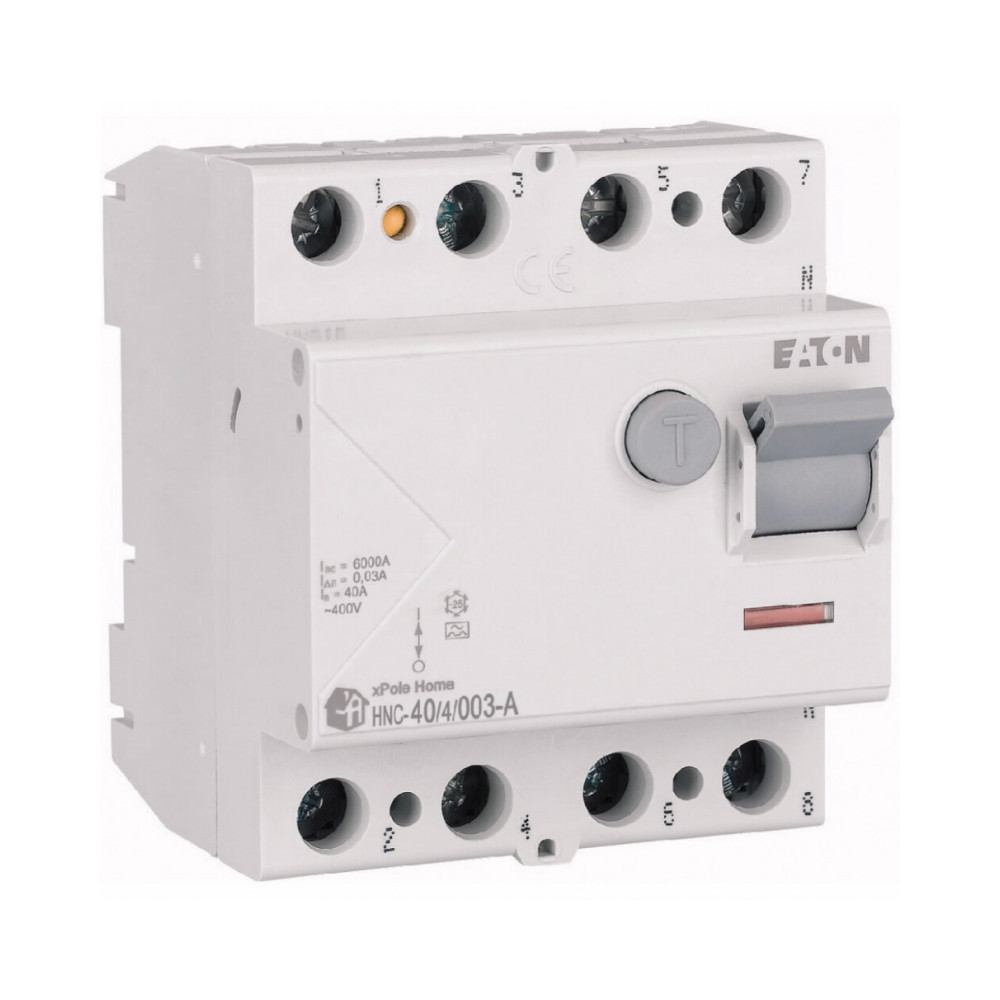 Пристрої захисного вимкнення (ПЗВ) або вимикачі диференціального струму Eaton серії HNC на струми до 63 А, 2- і 4-полюсні, зі струмами витоку 30 мА, типів AC і A, зі стійкістю до КЗ 6 кА, застосовують з метою захисту від ураження електрострумом під час прямого або непрямого дотику людини до струмоведучих частин устаткування, а також до частин, які можуть бути під напругою через пошкодження ізоляції. Крім цього, ПЗВ застосовуються для захисту обладнання від можливого виникнення пожежі. ПЗВ Eaton застосовуються в мережах TN-S, TN-C-S, TT і IT, де нейтральний і заземлювальний провідники розділені між собою.